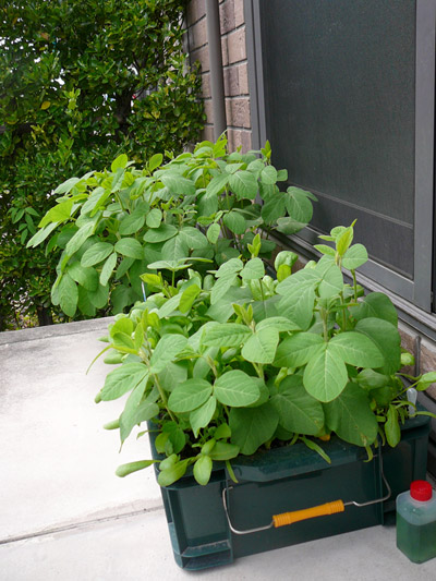 法蓮草と枝豆が、プランターの中でぎっちぎちに育っています。