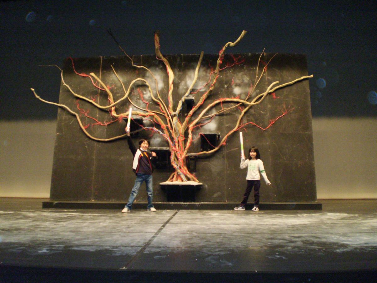 終演後・・・田村一行さんたちが、ワークショップということで、豊川の学校に行ったりしていたのを知り「なんで~っ、うちの学校には来ないんだっ 」と怒っていましたが・・・自分たちで「あの舞台に上がらせてほしい」とお願いし、関係者の方の計らいで、舞台で写真撮影をさせていただきました。